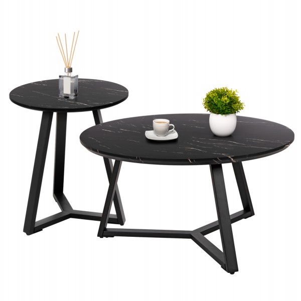 Ανακαλύψτε το σετ 2 στρογγυλών τραπεζιών σαλονιού ROCKET. Πρόκειται για 2 τραπεζάκια με διαφορετικές διαστάσεις που θα αποτελέσουν όμορφα αλλά και χρήσιμα στοιχεία στον χώρο σας. Οι επιφάνειες στηρίζονται σε μοντέρνες τρίποδες μεταλλικές βάσεις σε ΜΑΥΡΟ σαγρέ χρώμα, και είναι κατασκευασμένες από MDF σε χρώμα ΜΑΥΡΟΥ ΜΑΡΜΑΡΟΥ.