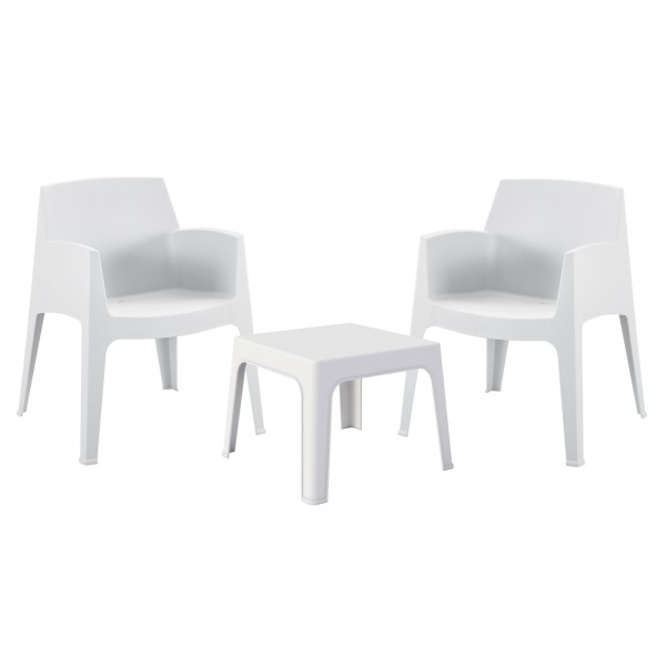 Ένα τετράγωνο τραπεζάκι και 2 στοιβαζόμενες πολυθρόνες, τα οποία είναι εξολοκλήρου κατασκευασμένα από πολυπροπυλένιο σε ΛΕΥΚΟ χρώμα. Σχεδιαστικά, είναι λιτό και μπορεί να χρησιμοποιηθεί με πολλούς τρόπους προσφέροντας πρακτική και ανθεκτική χρήση. Ιδανική πρόταση για χρήση σε εξωτερικούς χώρους, είτε επαγγελματικούς (χώροι δεξιώσεων, εταιρείες catering, κλπ.) είτε για το σπίτι.