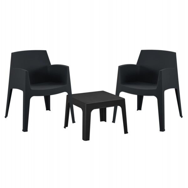 Ένα τετράγωνο τραπεζάκι και 2 στοιβαζόμενες πολυθρόνες, τα οποία είναι εξολοκλήρου κατασκευασμένα από πολυπροπυλένιο σε ΜΑΥΡΟ χρώμα. Σχεδιαστικά, είναι λιτό και μπορεί να χρησιμοποιηθεί με πολλούς τρόπους προσφέροντας πρακτική και ανθεκτική χρήση. Ιδανική πρόταση για χρήση σε εξωτερικούς χώρους, είτε επαγγελματικούς (χώροι δεξιώσεων, εταιρείες catering, κλπ.) είτε για το σπίτι.
