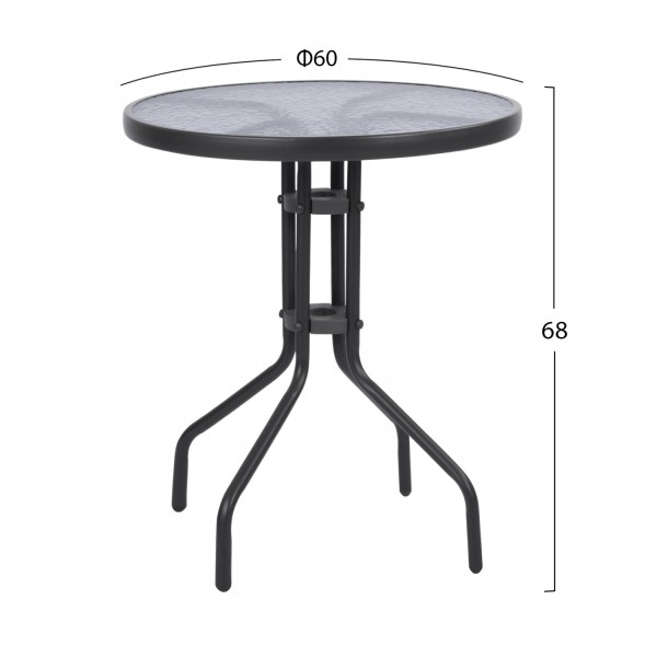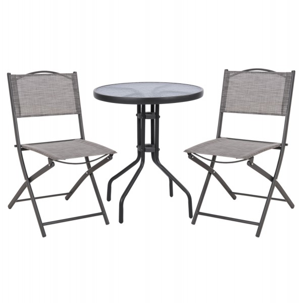Σετ εξωτερικού χώρου με στρογγυλό τραπέζι με ΓΚΡΙ μεταλλικό σκελετό και γυάλινη θολή ΕΝΙΣΧΥΜΕΝΗ επιφάνεια και 2 μεταλλικές πτυσσόμενες καρέκλες με textilene, σε ΓΚΡΙ χρώμα.