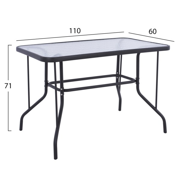 Σετ εξωτερικού χώρου με ορθογώνιο τραπέζι με ΣΚΟΥΡΟ ΓΚΡΙ μεταλλικό σκελετό και γυάλινη θολή ΕΝΙΣΧΥΜΕΝΗ επιφάνεια και 4 μεταλλικές πτυσσόμενες καρέκλες με textilene, σε ΓΚΡΙ χρώμα.