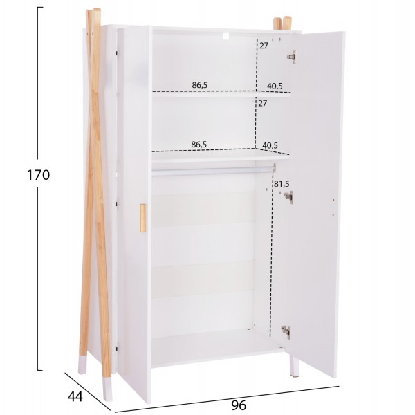 Παιδική ντουλάπα μελαμίνης σε ΛΕΥΚΟ χρώμα με σκελετό ξύλου πεύκου σε χιαστί διάταξη.