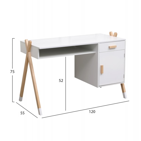 Παιδικό γραφείο με ένα συρτάρι κι ένα ντουλαπάκι. Μελαμίνη σε ΛΕΥΚΟ χρώμα με σκελετό ξύλου πεύκου σε χιαστί διάταξη.