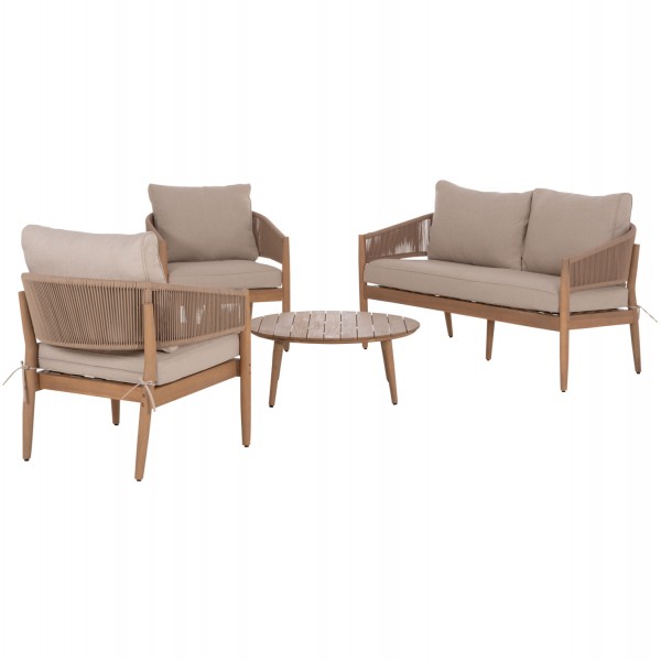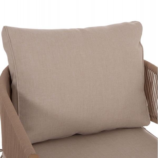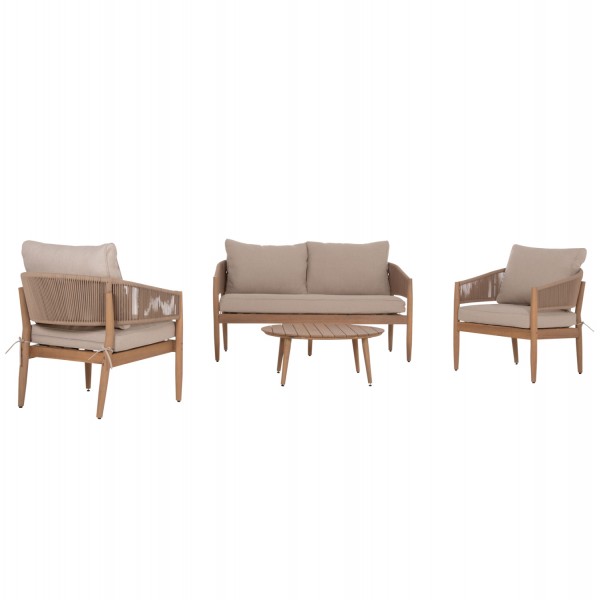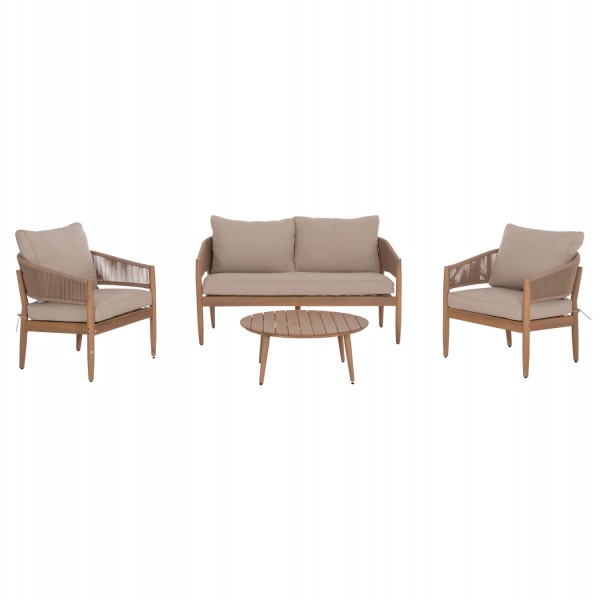 Ο μεταλλικός σκελετός εξασφαλίζει αντοχή και σταθερότητα, ενώ τα πόδια από ξύλο ακακίας προσθέτουν ζεστασιά και φυσικό χαρακτήρα. Η επένδυση πλάτης με σχοινί δημιουργεί ιδιαίτερη υφή και αίσθηση χαλάρωσης, ενώ τα μαξιλάρια από πολυεστερικό ύφασμα σε μπεζ απόχρωση προσφέρουν άνεση και κομψότητα. Το τραπεζάκι με επιφάνεια ακακίας, είναι ιδανικό για καθημερινή χρήση σε εξωτερικούς χώρους.
