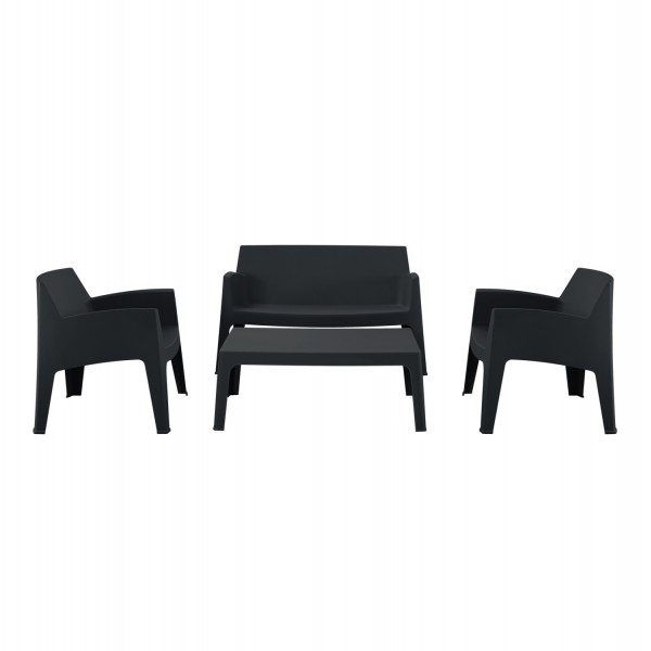 Ένα ορθογώνιο τραπεζάκι, 2 στοιβαζόμενες πολυθρόνες κι έναν 2-θέσιο καναπέ, τα οποία είναι εξολοκλήρου κατασκευασμένα από πολυπροπυλένιο σε ΜΑΥΡΟ χρώμα. Σχεδιαστικά, είναι λιτό και μπορεί να χρησιμοποιηθεί με πολλούς τρόπους προσφέροντας πρακτική και ανθεκτική χρήση. Ιδανική πρόταση για χρήση σε εξωτερικούς χώρους, είτε επαγγελματικούς (χώροι δεξιώσεων, εταιρείες catering, κλπ.) είτε για το σπίτι.