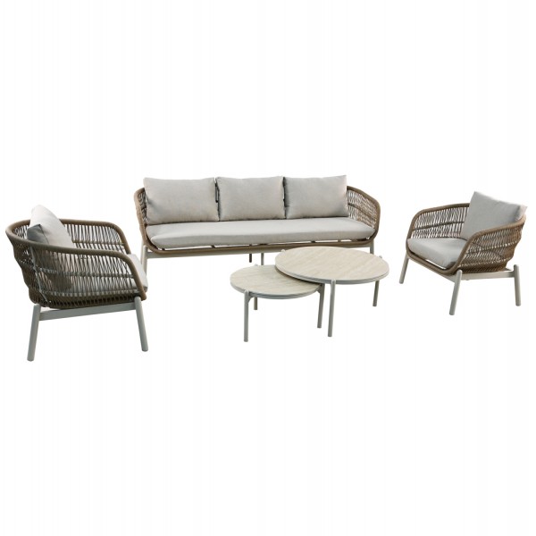 Το σετ περιλαμβάνει έναν 3θέσιο καναπέ, δύο πολυθρόνες ίδιας σχεδίασης και δύο στρογγυλά τραπεζάκια με κεραμικές επιφάνειες, δημιουργώντας έναν καλαίσθητο και λειτουργικό χώρο εξωτερικής καθιστικής απόλαυσης.