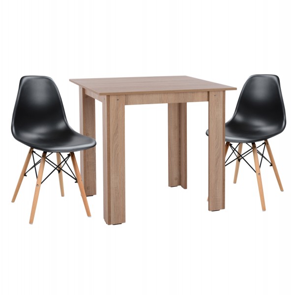 Ένα τετράγωνο τραπέζι μελαμίνης σε χρώμα SONAMA OAK, και 2 καρέκλες με ενιαία πλάτη και κάθισμα από πολυπροπυλένιο σε ΜΑΥΡΟ χρώμα και πόδια οξιάς σε φυσικό χρώμα.