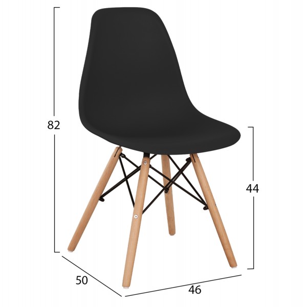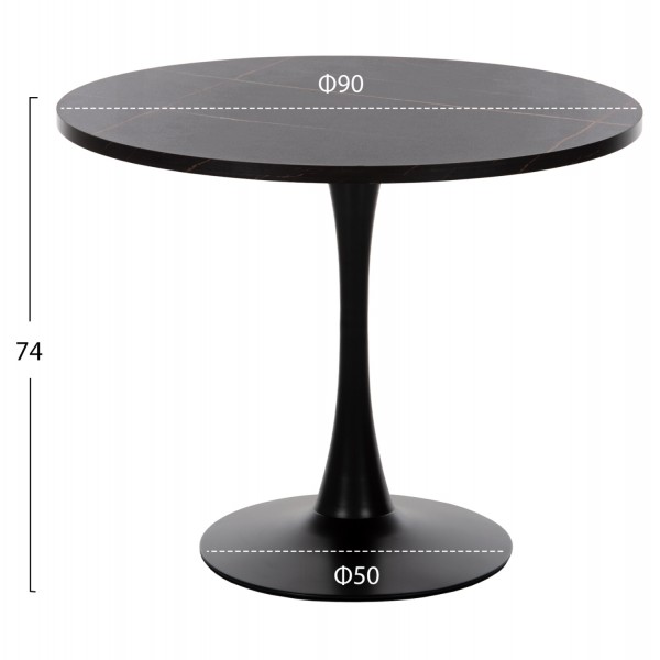 Ένα στρογγυλό τραπέζι με μεταλλική κολώνα σε ΜΑΥΡΟ χρώμα και επιφάνεια μελαμίνης σε χρώμα ΜΑΥΡΟΥ ΜΑΡΜΑΡΟΥ, και 2 καρέκλες με ενιαία πλάτη και κάθισμα από πολυπροπυλένιο σε ΜΑΥΡΟ χρώμα και πόδια οξιάς σε φυσικό χρώμα.