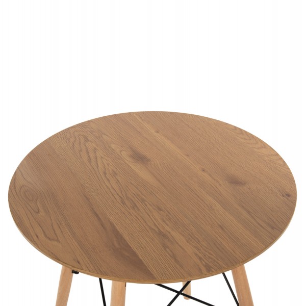 Ένα στρογγυλό τραπέζι με πόδια οξιάς σε ΦΥΣΙΚΟ χρώμα και MDF επιφάνεια σε χρώμα φυσικού ξύλου, και 2 καρέκλες με ενιαία πλάτη και κάθισμα από πολυπροπυλένιο σε ΚΑΠΟΥΤΣΙΝΟ χρώμα και πόδια οξιάς σε φυσικό χρώμα.