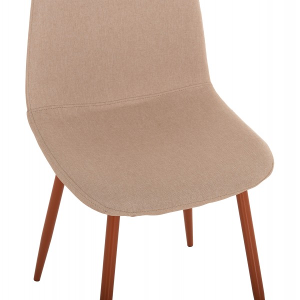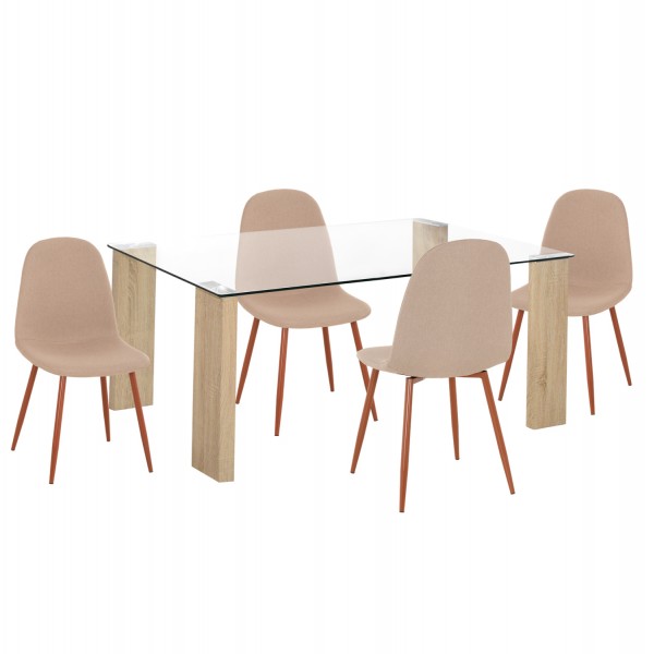 Ένα ορθογώνιο τραπέζι με πόδια από MDF σε SONAMA χρώμα και γυάλινη επιφάνεια, και 4 καρέκλες με πόδια μεταλλικά σε καφετί χρώμα και κάθισμα με επένδυση από ΜΠΕΖ ύφασμα.