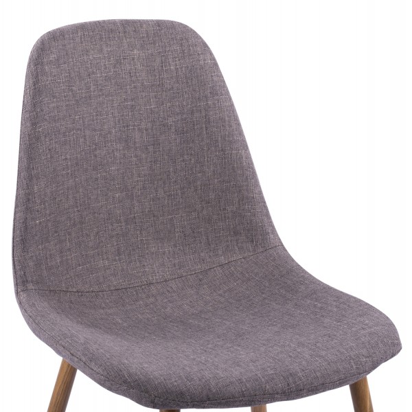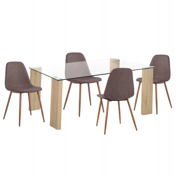 Ένα ορθογώνιο τραπέζι με πόδια από MDF σε SONAMA χρώμα και γυάλινη επιφάνεια, και 4 καρέκλες με πόδια μεταλλικά με όψη ξύλου και κάθισμα με επένδυση από καφετί ύφασμα.