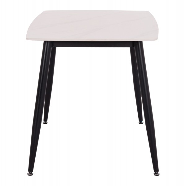 Ένα ορθογώνιο τραπέζι με σκελετό μεταλλικό σε ΜΑΥΡΟ χρώμα και κεραμική επιφάνεια με όψη ΛΕΥΚΟΥ ΜΑΡΜΑΡΟΥ, και 4 καρέκλες με ψηλή πλάτη και κάθισμα με επένδυση από βελούδινο ύφασμα σε χρώμα ΣΑΠΙΟ ΜΗΛΟ και μεταλλικό σκελετό σε ΜΑΥΡΟ χρώμα.