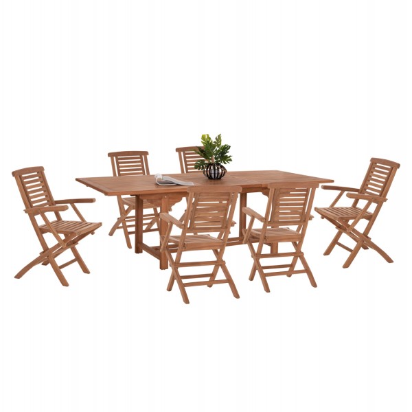 Αυτό το Σετ τραπεζαρίας εξωτερικού χώρου διαθέτει επεκτεινόμενο ορθογώνιο τραπέζι και 6 πτυσσόμενες πολυθρόνες, όλα κατασκευασμένα από ξύλο TEAK σε ΦΥΣΙΚΟ χρώμα.