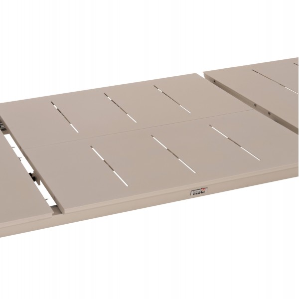Ένα ορθογώνιο ΕΠΕΚΤΕΙΝΟΜΕΝΟ τραπέζι εξολοκλήρου από αλουμίνιο σε ΜΠΕΖ χρώμα, και 6 καρέκλες αλουμινίου σε ΜΠΕΖ με όμορφη minimal πλάτη και μαξιλάρι καθίσματος πάχους 3εκ με επένδυση από OLEFIN ύφασμα και αφρό γεμίσματος ποιότητας 25D για εξαιρετική αίσθηση κατά την χρήση, ενώ η λεπτομέρεια με το ξύλο teak στα μπράτσα ανεβάζει τον πήχυ της ποιότητας.
