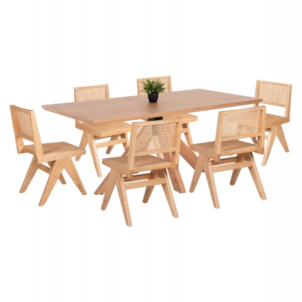 Αυτό το πολυτελές σετ τραπεζαρίας εσωτερικού χώρου αποτελείται από ένα τραπέζι PAOLO και 6 καρέκλες FREDRIK. Το PAOLO είναι ένα πανέμορφο ορθογώνιο τραπέζι με επιφάνεια από MDF με καπλαμά από Manchurian wood (είδος φράξου) σε χρώμα ΦΥΣΙΚΟ (oak). Η φαλτσοκομμένη επιφάνεια αυτή, στηρίζεται σε μια μαύρη μεταλλική βάση/κολώνα στην οποία μοντάρονται 4 πόδια από μασίφ rubberwood, επίσης σε ΦΥΣΙΚΟ χρώμα. Οι καρέκλες FREDRIK διαθέτουν μοντέρνο σκελετό από ποιοτικό ξύλο φράξινου με ορθές γωνίες και ξεκάθαρες «γραμμές». Το κάθισμα και η πλάτη αποτελούνται από φυσικό Rattan σε «τρυπητό» στυλ, ολοκληρώνοντας το μοντέρνο «look» της καρέκλας.