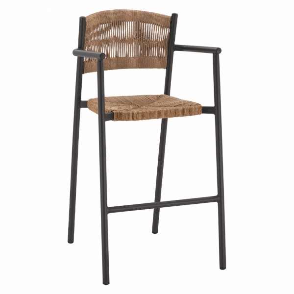 Μοντέρνο σκαμπό bar, κατασκευασμένo από σκελετό αλουμινίου σε γκρι απόχρωση, επενδυμένο με σχοινί στην πλάτη και στο κάθισμα σε μπεζ απόχρωση. Ένα σκαμπό άριστης ποιότητας και κατασκευής με χειροποίητη πλέξη στο κάθισμά του. Ιδανικό για χώρους εστίασης αλλά και για το σπίτι σας, θα χαρίσει ένα μοντέρνο και ιδιαίτερο αποτέλεσμα στον χώρο σας.
