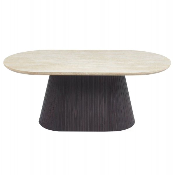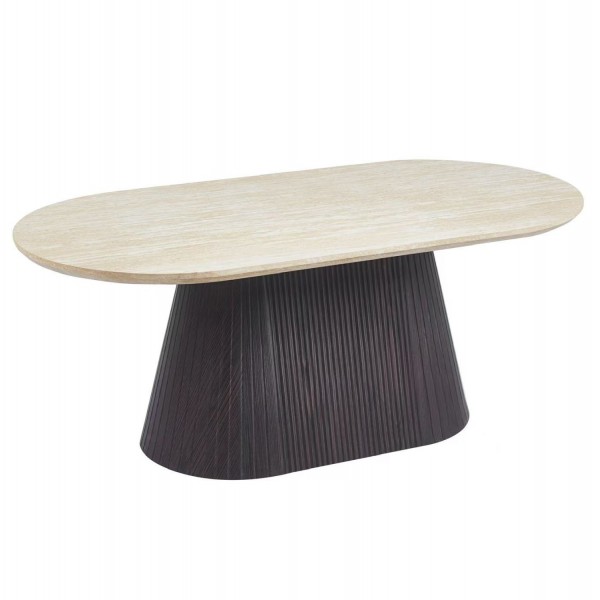 Το τραπέζι σαλονιού CATER είναι οβάλ και αποτελεί νέα προσθήκη στην γκάμα μας. Η επίπεδη επιφάνειά του είναι κεραμική σε χρωματισμό TRAVERTINE STONE, ενώ η βάση του είναι κατασκευασμένη εξολοκλήρου από MDF σε χρώμα ΣΚΟΥΡΟ ΚΑΦΕ, με όμορφες πτυχώσεις.