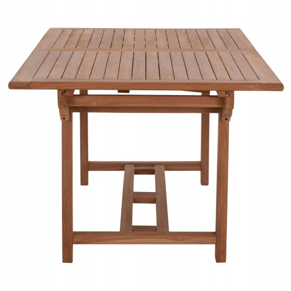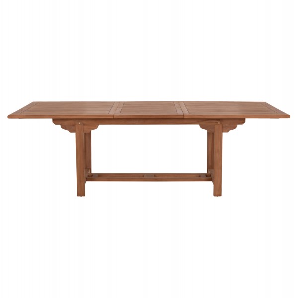 Ανοιγόμενο τραπέζι τραπεζαρίας εξωτερικού χώρου CRANDER, κατασκευασμένο από μασίφ ξύλο teak υψηλής αντοχής. Διαθέτει πρόσθετο κομμάτι στο κέντρο που επιτρέπει την επέκταση του μήκους, προσαρμόζοντας το εύκολα στις ανάγκες φιλοξενίας περισσότερων ατόμων. Το teak προσφέρει φυσική αντοχή στις καιρικές συνθήκες, καθιστώντας το ιδανικό για εξωτερική χρήση με διαχρονική αισθητική.