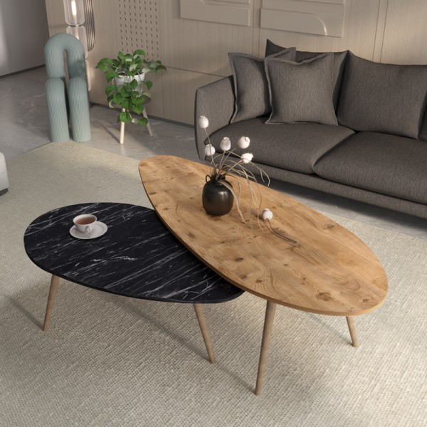 Αναβαθμίστε το σαλόνι σας με αυτό το εντυπωσιακό σετ δύο τραπεζιών, σχεδιασμένο για να προσφέρει τόσο στυλ όσο και πρακτικότητα. Τα δύο τραπεζάκια διαφέρουν σε μέγεθος και ύψος, επιτρέποντας σας να τα χρησιμοποιήσετε με διάφορους τρόπους—είτε το ένα μέσα στο άλλο για εξοικονόμηση χώρου, είτε το ένα δίπλα στο άλλο για περισσότερη επιφάνεια.