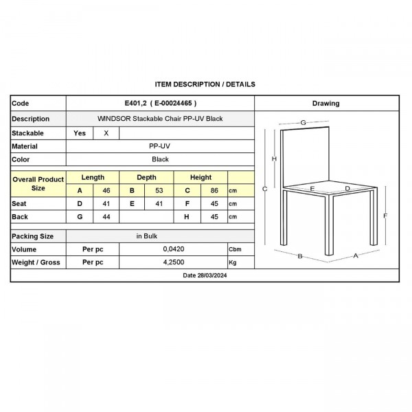 Vento Καρέκλα Τραπεζαρίας Κήπου Στοιβαζόμενη PP Μαύρο UV Protection 46x53x86cm