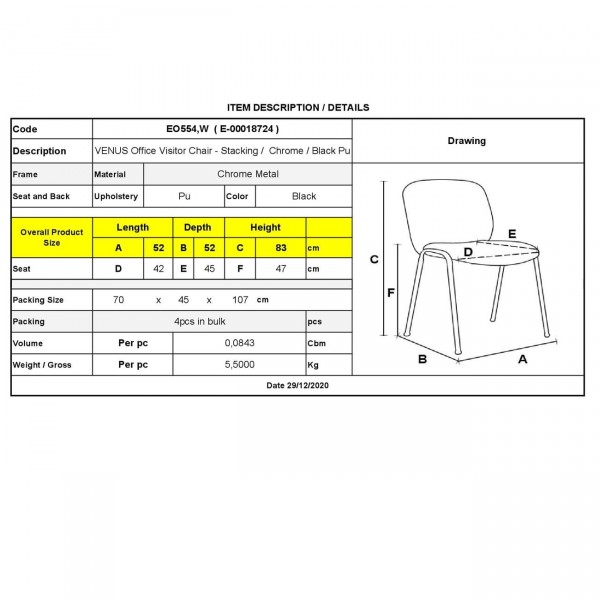 VENUS Καρέκλα Γραφείου Επισκέπτη, Στοιβαζόμενη Μέταλλο Χρώμιο, Pu Μαύρο