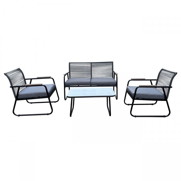 ROCCO Set Σαλόνι Κήπου 4τεμ Μέταλλο Μαύρο RopeWicker Γκρι Μαξιλ Σκούρο Γκρι Γυαλί Μαύρο c491495